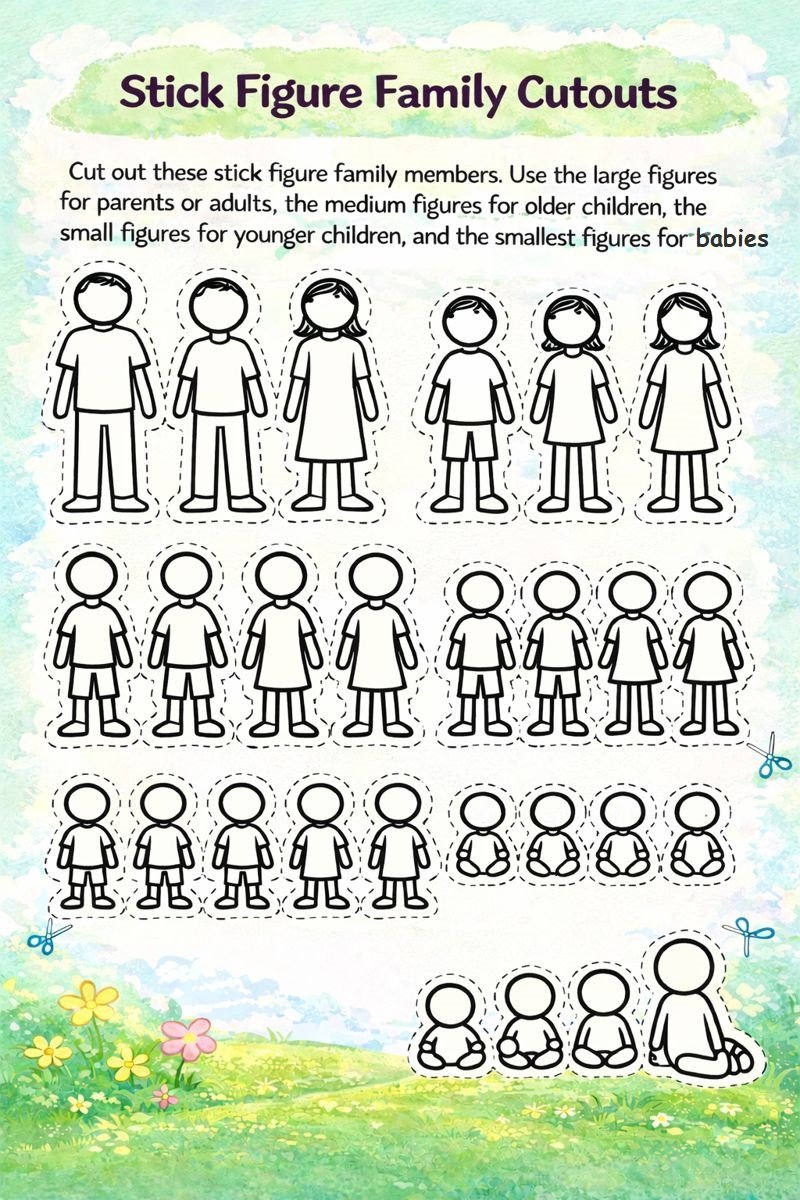 A printable set of simple family figures in different sizes, designed to support children to show who is in their family without having to draw from scratch. The neutral, blank faces and minimal detail allow children to add their own expressions, colours and identities. This tool can be used alongside the family tree to explore relationships, roles and who feels important or close.
